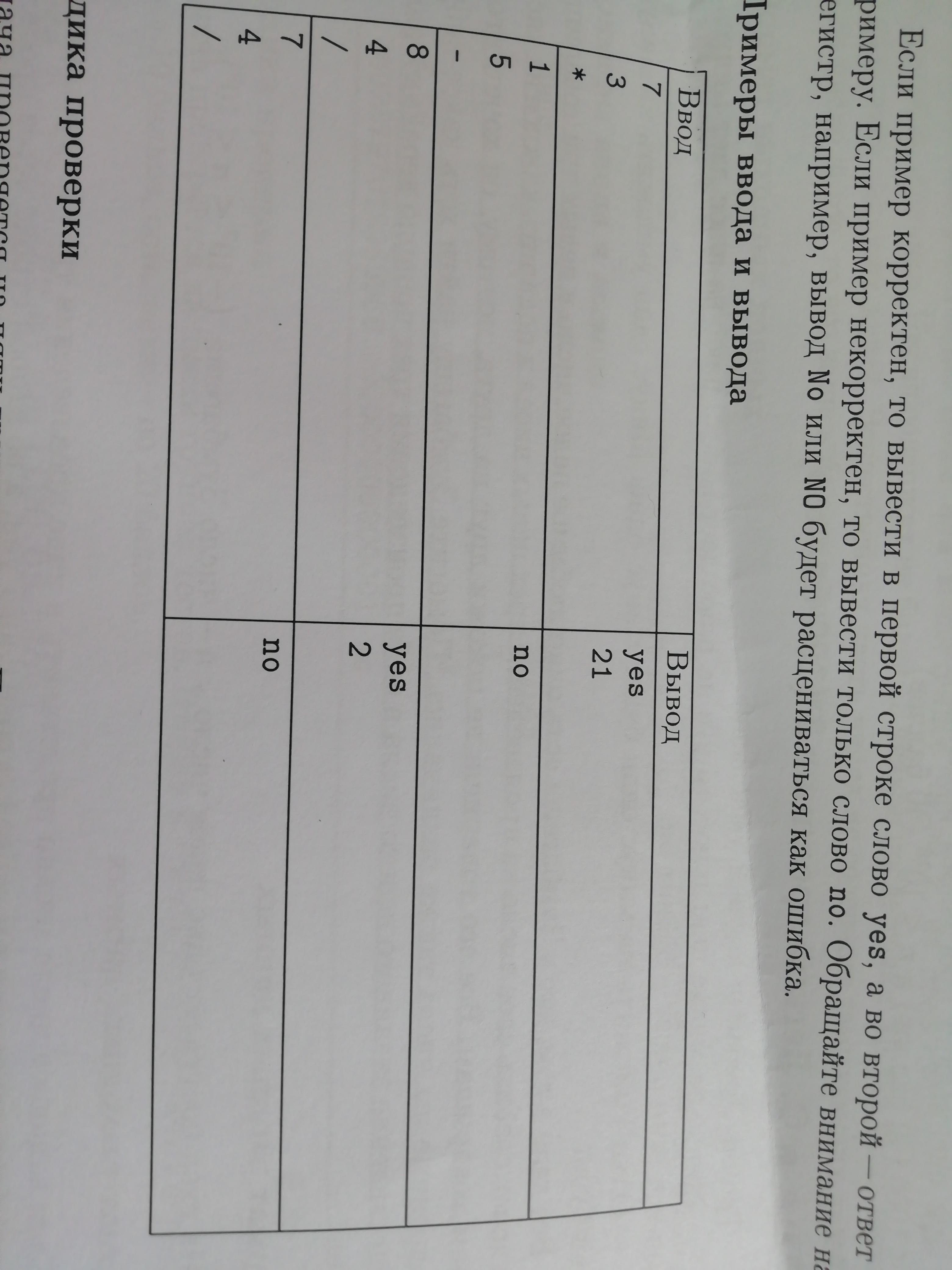 Если пример корректен, то вывести в первой строке слово yes, а во второй - ответ к примеру. Если пример некорректен, то вывести только слово no. Обращайте внимание на регистр, например, вывод No NO будет расцениваться как ошибка.