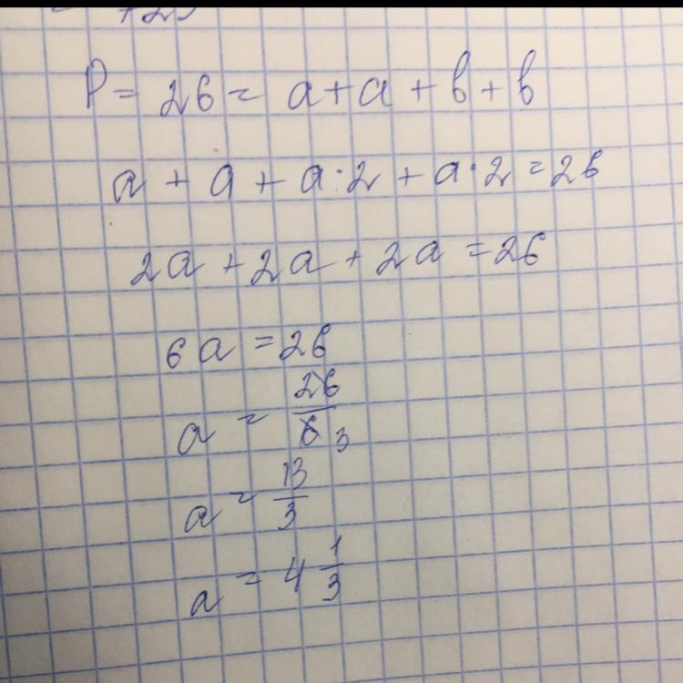 периметр прямоугольника равен 26 см. Найдите стороны прямоугольника, если одна сторона в 2 раза больше другой