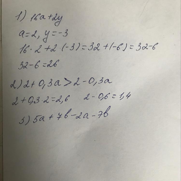 Помогите алгебра 7 класс найдите значение выражения 16а + 2у при а= 2, у=-3