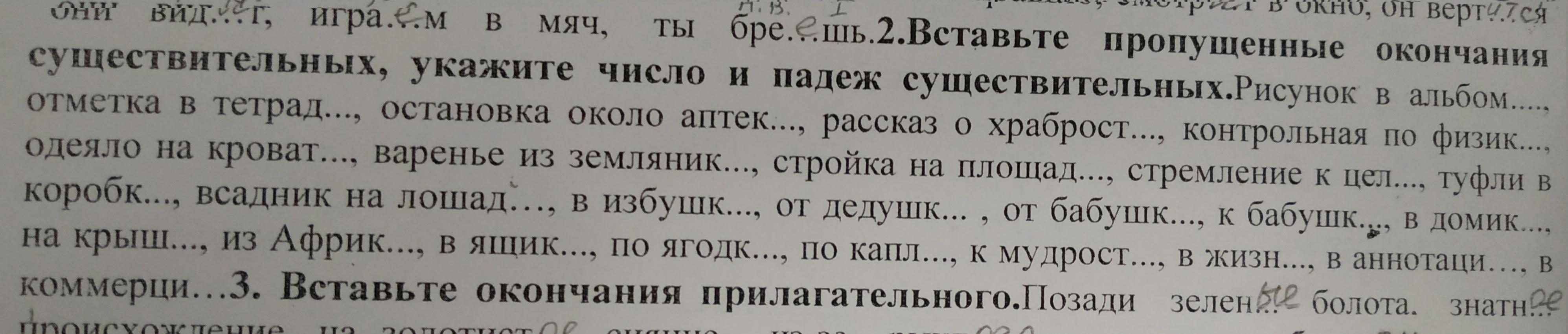 Вставить пропущенные окончания существительных, указать число и падеж существительного.
