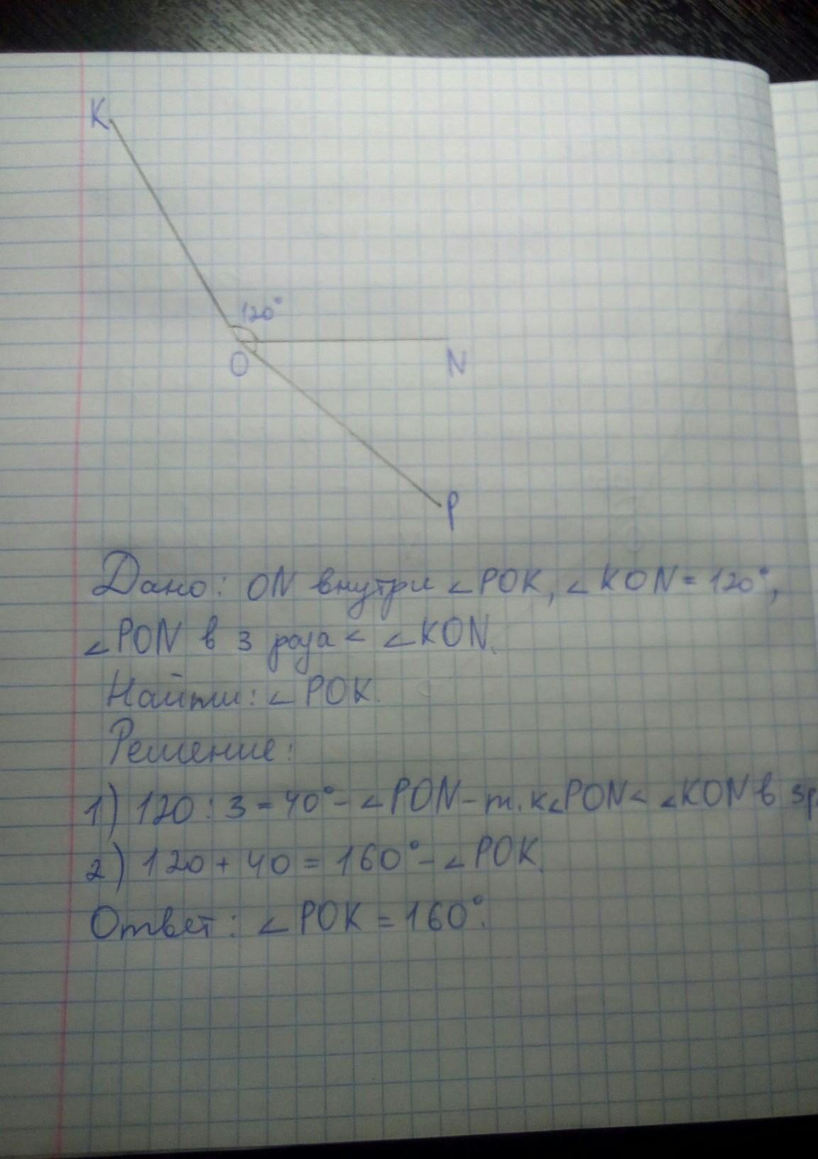 Из точки О выходят три луча ОР,ОN и ОК,причём луч ОN лежит внутри угла РОК.Определите градусную меру угла РОК если угол KON=120 градусов,угол PON в 3 раза меньше чем угол KON.