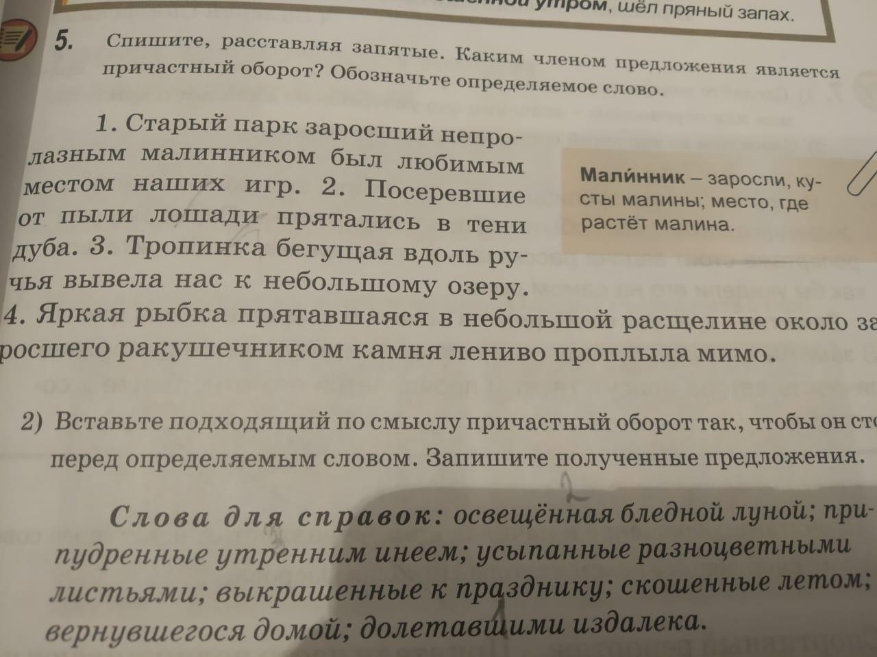 1. старый парк, заросший непролазным малинником, был любимым местом наших игр. 2. посеревшие от пыли лошади прятались в тени дуба. 3. тропинка, бегущая вдоль ручья, вывела нас к небольшому озеру. 4. яркая рыбка, прятавшаяся в небольшой расщелине около заросшего ракушечником камня, лениво проплыла мимо.