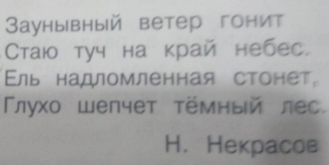 заунывный прил., ветер сущ., гонит гл., стаю сущ., туч сущ.,на предл., край сущ., небес сущ., ель сущ., надломленная прил стонет гл., глухо нареч., шепчет гл., тёмный прил., лес сущ..