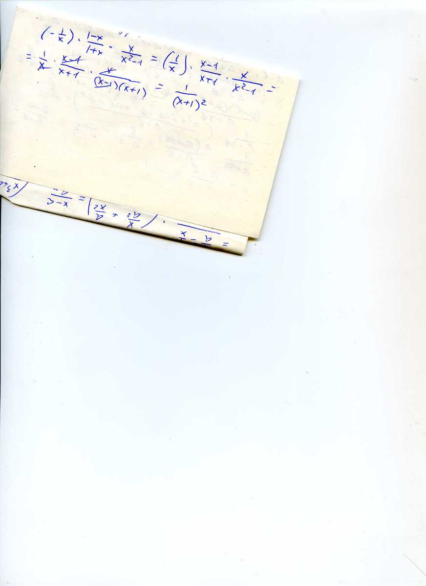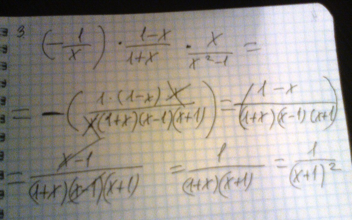(-1/x)*(1-x)/(1+x)*x/(x2-1)=(1/x)*(x-1)/(x+1)*x/(x-1)(x+1)= {x2-1=(x-1)(x+1) минус от -1/x перешел к 1-х и стал х-1}= {сокращаются х и х-1} = 1/(x+1)^2