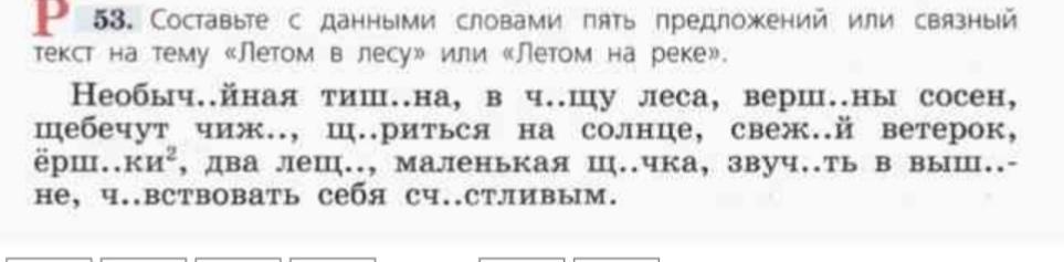Слова: необычАйная, тишИна, в чАщу, вершИны, чижЫ, щУриться, свежИй, ёршики, лещА, щУчка, звучАть, вышИне, чУвствовать, счАстливым.
