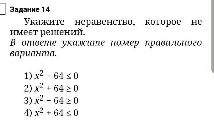 Неравенство x² + 64 ≤ 0 не имеет решений так как x² + 64 > 0 при любых значениях x .