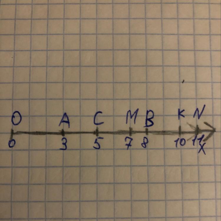 Начертите координатный луч, приняв за единичный отрезок длину оной клетки тетради. Отметьте на этому лучше точки M(7), A(3), N(11), B(8), K(10, и C(5).