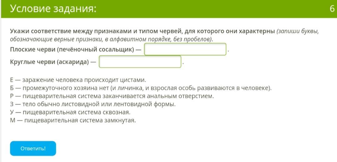 Ответ:печеночный сосальщик З,М,Е; Аскарилада Б,Р,У