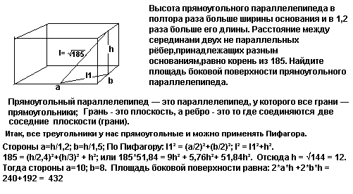 Высота прямоугольного параллелепипеда в полтора раза больше ширины основания и в 1, 2 раза больше его длины. Расстояние между серединами двух не параллельных ребер, принадлежащих разным основаниям, равно квадратный корень из 185 . Найдите площадь боковой поверхности прямоугольного параллелепипеда.