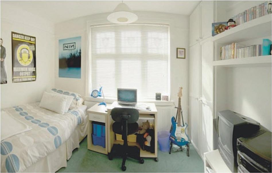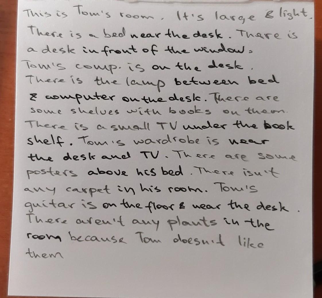 This is Tom´s room. It´s large and light. There is a bed … . There is a desk … . Tom´s computer is … . There is the lamp … . There are some shelves with books on them. There is a small TV … . Tom´s wardrobe is … . There are some posters … . There isn´t any carpet … . Tom´s guitar is … . There aren´t any plants … because Tom doesn´t like them.