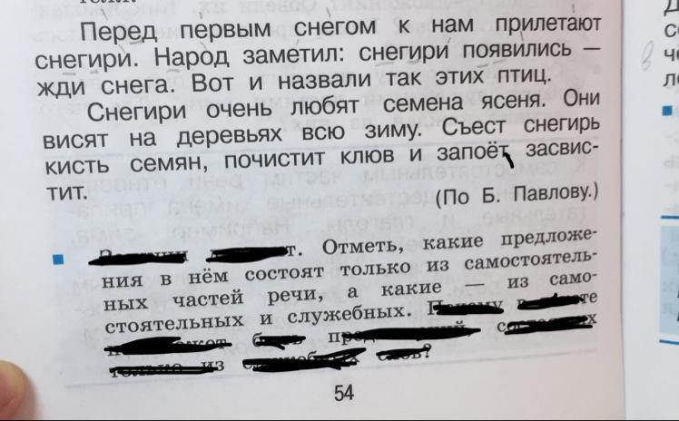 Перед первым снегом к нам прилетают снегири. (состоит из служебных и самостоятельных частей речи, так как "к" предлог) Народ заметил: снегири появились-жди снега (состоит только из самостоятельных частей речи) Вот и назвали так этих птиц(состоит из служебных и самостоятельных частей речи, так как "и" союз) Снегири очень любят семена ясеня(состоит только из самостоятельных частей речи) Они висят на деревьях всю зиму (состоит из служебных и самостоятельных частей речи, так как н предлог) Съест снегири кисть семян, почистит клюв и за поёт, засвистит (состоит из служебных и самостоятельных частей речи, так как и союз)