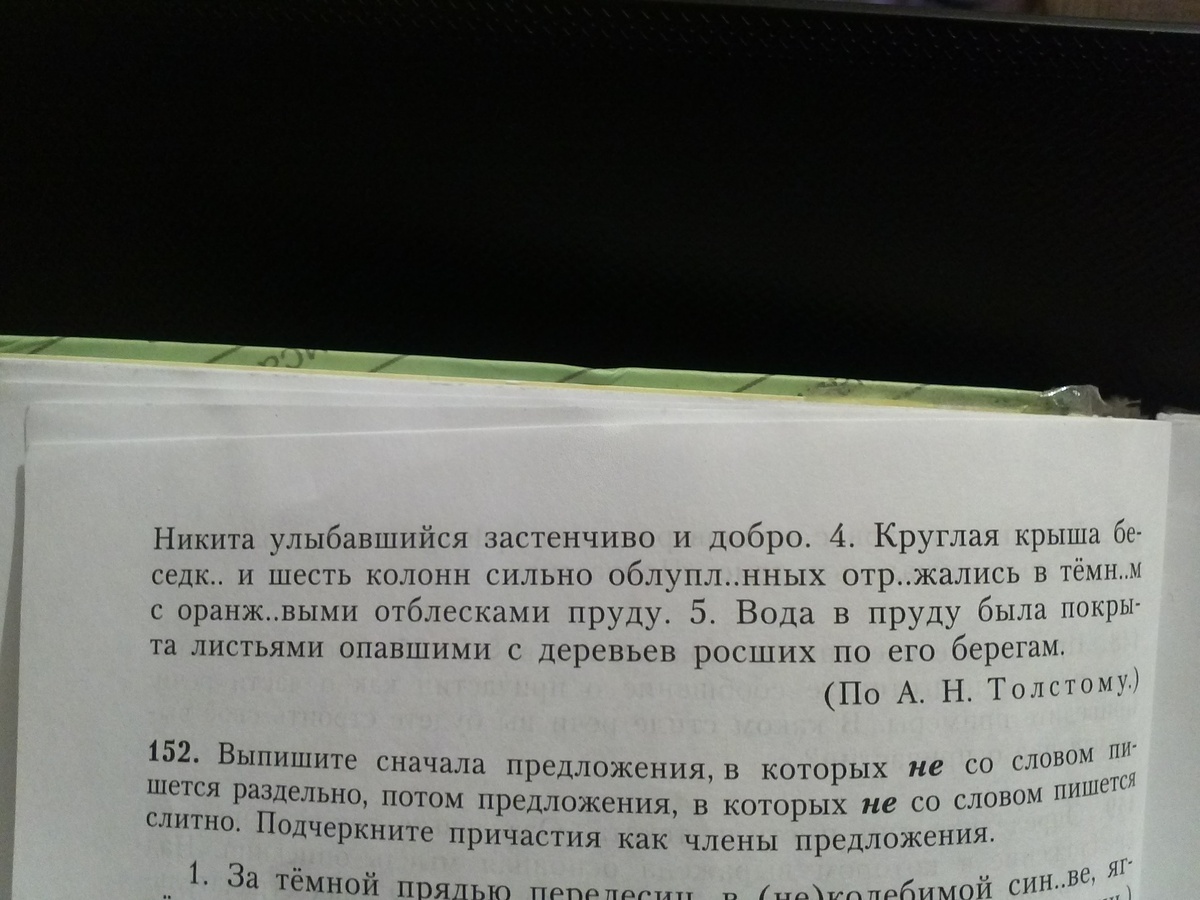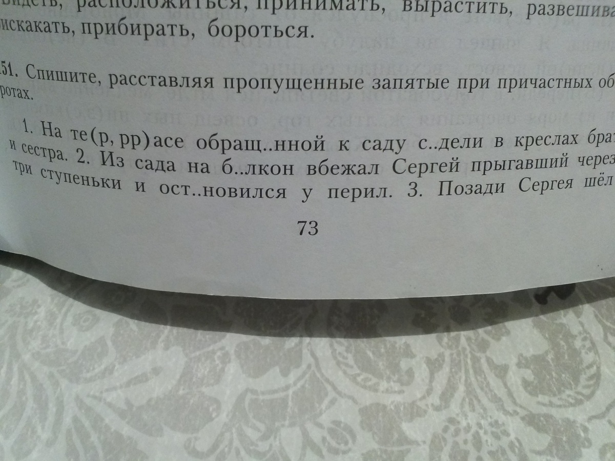 На террасе, обращенной к саду, сидели в креслах брат и сестра. Из сада на балкон вбежал Сергей, прыгавший через три ступеньки, и остановился у перил. Позади Сергея шёл Никита, улыбавшийся застенчиво и добро. Круглая крыша, беседка и шесть колонн, сильно облупленных, отражались в тёмном с оранжевым отблесками в пруду. Вода в пруду была покрыта листьями, опавшими с деревьев, росших по его берегам.