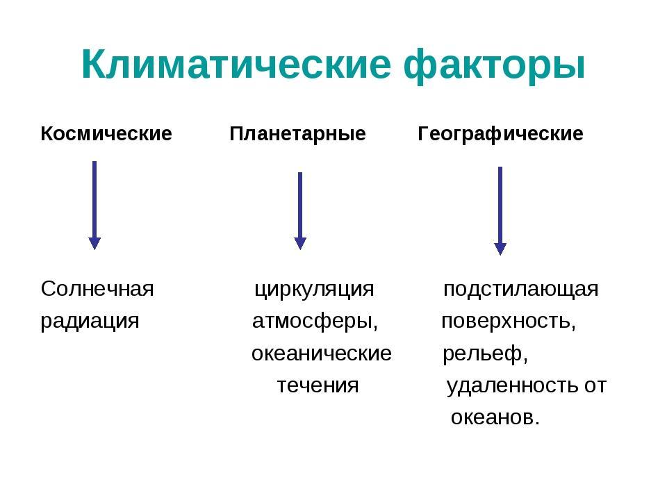 Климатические: условия, определяющие климат местности: - географическая широта, определяющая зональность и сезонность поступления солнечной радиации на земную поверхность; - высота над уровнем моря, от которой зависит высотная поясность; - распределение суши и моря. (мне лень продолжать, на картинке есть)