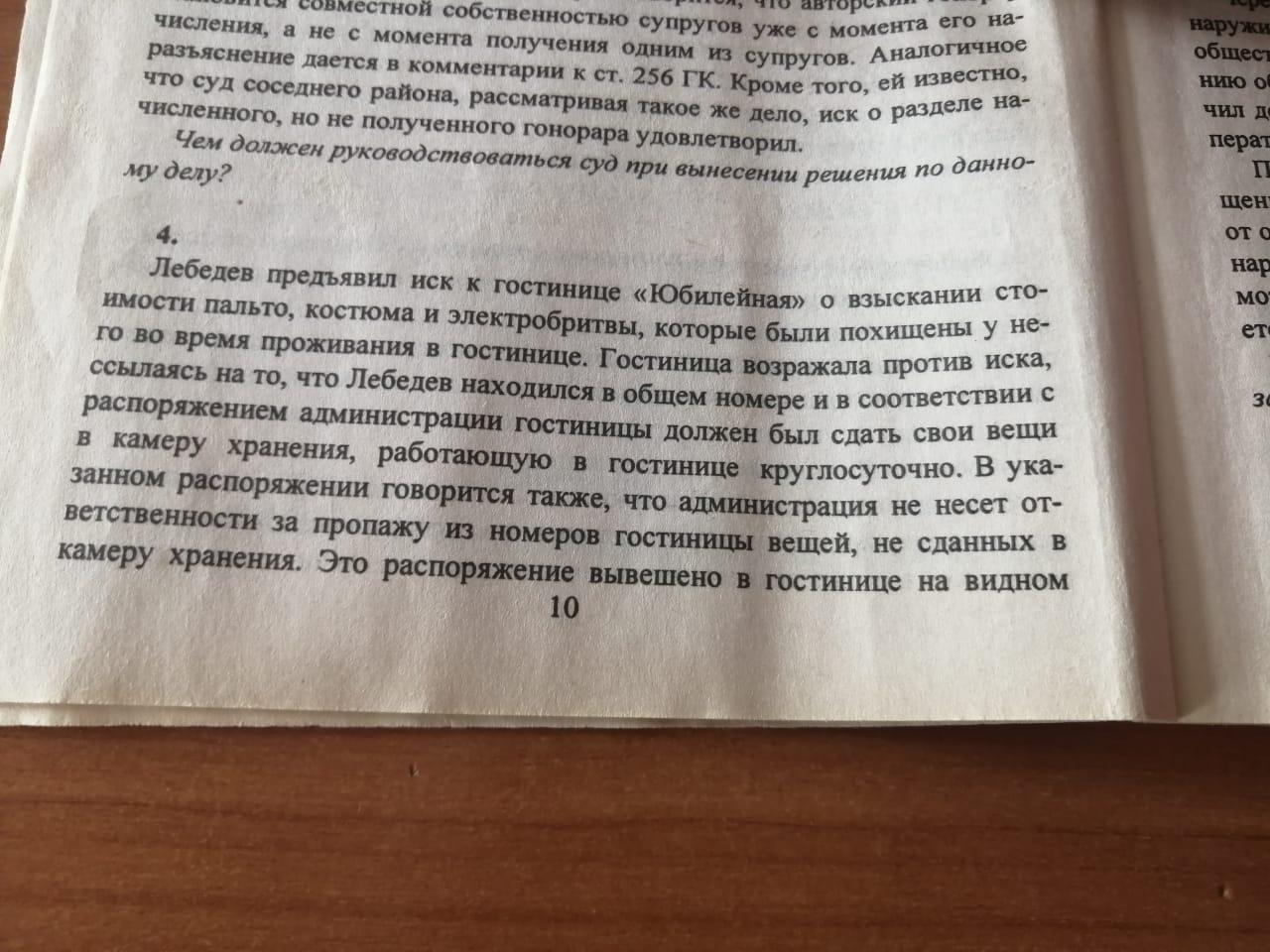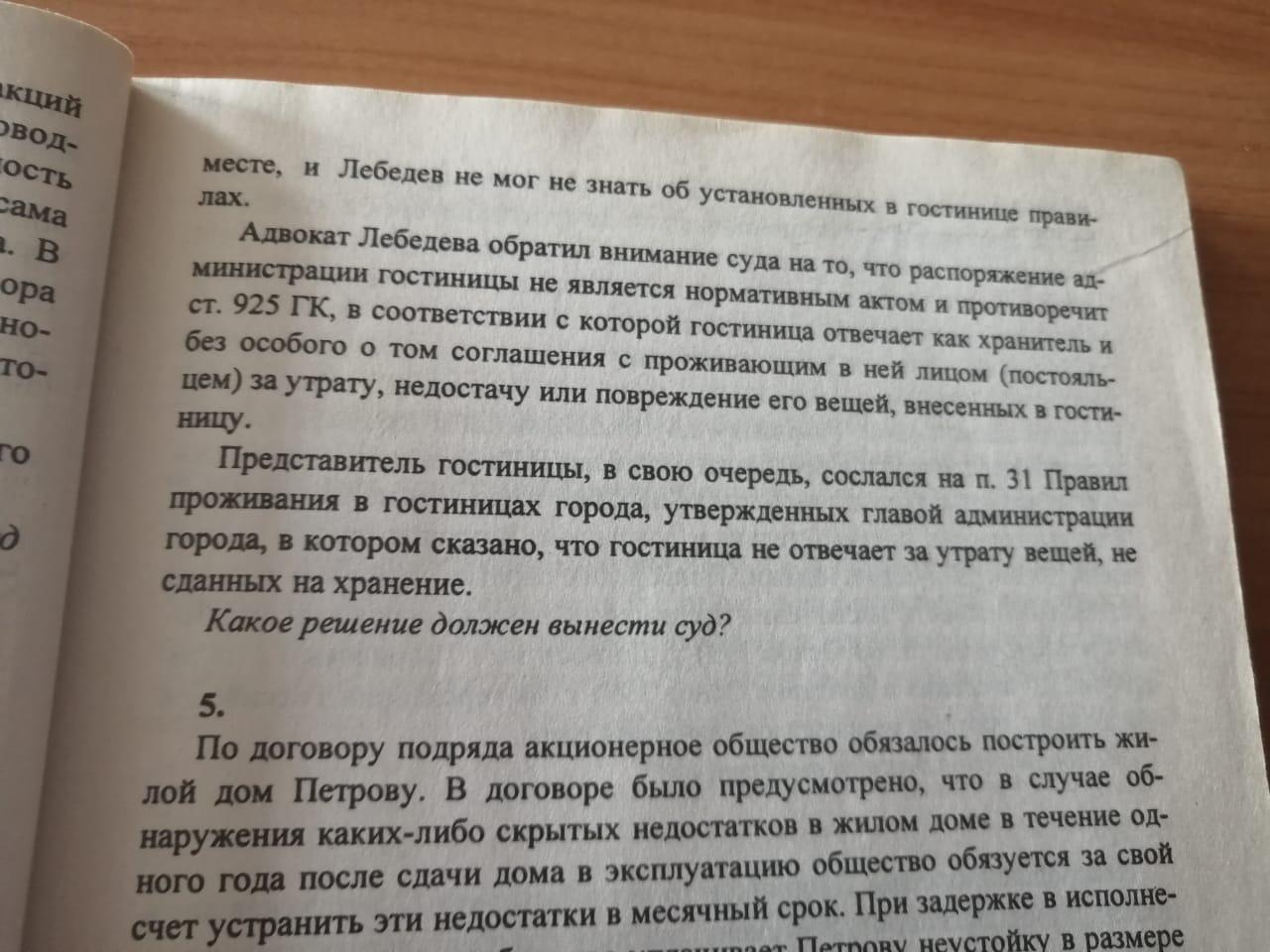 4)Так как распоряжение администрации гостиницы не является нормативным актом и противоречит ст. 925 ГК, в соответствие с которой гостиница отвечает как хранитель и без особого о том соглашения с проживающим в ней лицом (постояльцем) за утрату, недостачу или повреждение его вещей, внесенных в гостиницу, то действовать будет именно норма ГК РФ (в соответствии со ст. 3 ГК РФ).