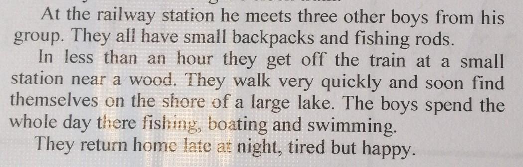 In less than an hour they got off the train at a small station near a wood. They walked very quickly and soon found themselves on the shore of a large lake. The boys spent the whole day there fishing, boating and swimming.
