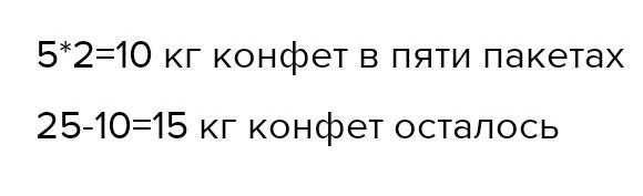 В коробке 25 кг конфет . Часть из них разложили в 5 пакетов по 2 кг в каждый . Сколько килограммов конфет осталось?