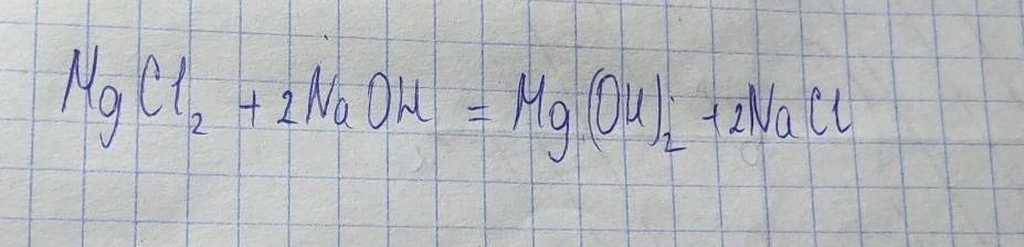 MgCl2 (хлорид магния) + 2 NaOH (гидроксид натрия) = Mg(OH)2 (гидроксид магния) + 2 NaCl (хлорид натрия) (обмен)