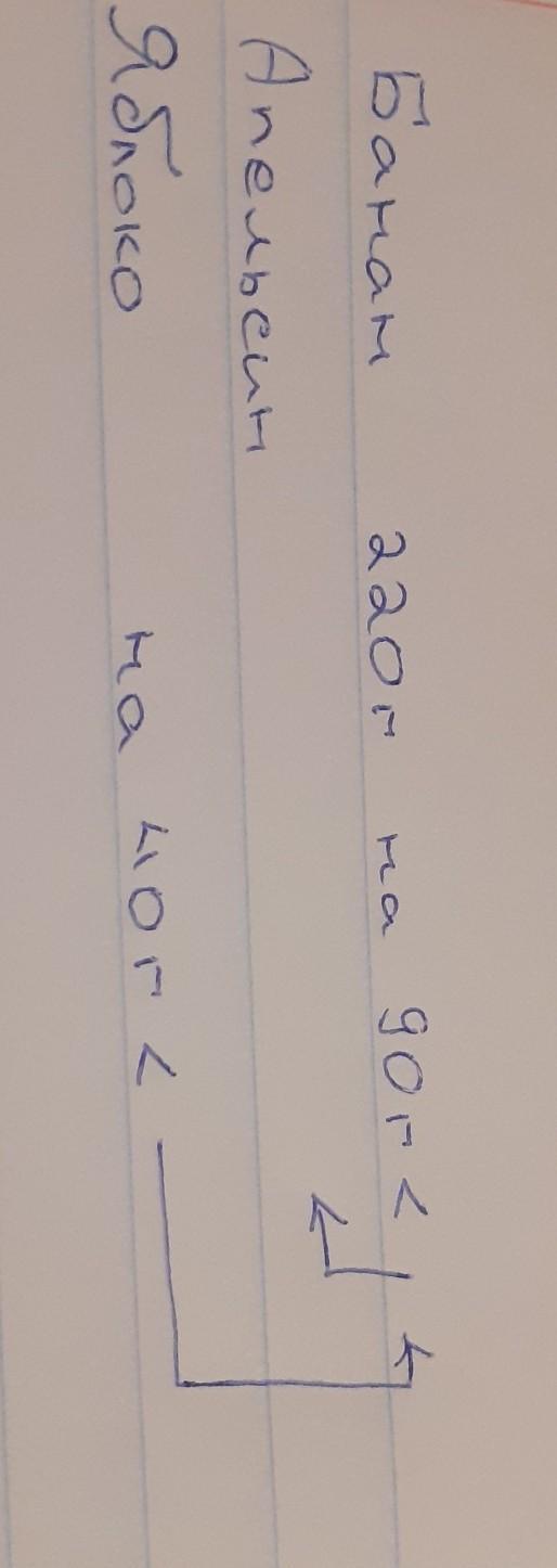 банан весит 220г это на 90г меньше массы апельсина и на 40 г больше массы яблока. Определите массу банана яблока и апельсина