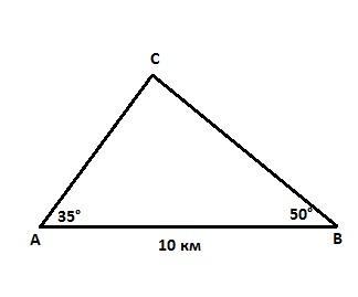 В условиях плохой видимости с береговых радиомаяков А и В, расстояние между которыми равно 10 км, запеленговано судно С. Определите расстояние от судна до каждого маяка, если с помощью радиопеленгаторов определены углы САВ и СВА 35∘ и 50∘ градусов соответственно. В ответ запишите сумму расстояний AC+CB. Ответ округлите до целых.