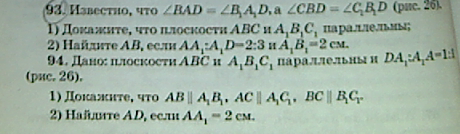 1) Т к углы BAD и B1A1D равны, углы CBD и C1B1D равны, то АВ || А1В1, ВС || В1С1 по равенству соответственных углов (признак). Если две пересекающиеся прямые одной плоскости параллельны двум пересекающимся прямым другой плоскости, то такие плоскости параллельны, (АВС) || (А1В1С1).