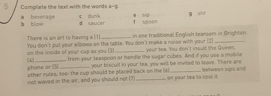 There is an art to having a (1) a beverage in one traditional English tearoom in Brighton. You don't put your elbows on the table. You don't make a noise with your [2] f spoon on the inside of your cup as you [3) g stir your tea. You don't insult the Queen, (4) c drink from your teaspoon or handle the sugar cubes. And if you use a mobile phone or (5) e dip your biscuit in your tea, you will be invited to leave. There are other rules, too: the cup should be placed back on the (6) d saucer between sips and not waved in the air, and you should not [7] b blow on your tea to cool it.