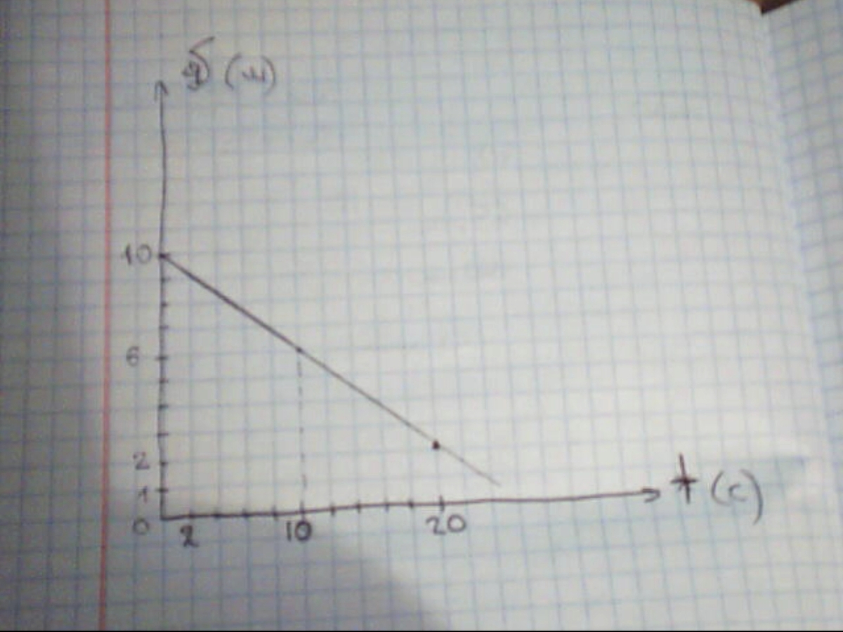 Скорость автомобиля за 10 сек уменьшилась с 10 до 6 м/с.Написать формулу зависимости скорости от времени,построить график этой зависимости и по графику определить скорость через 20 сек