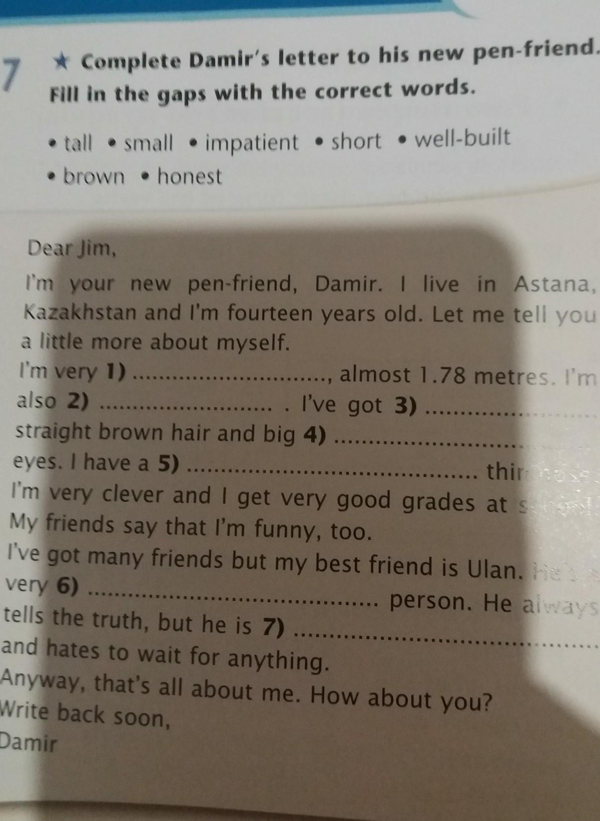 Complete Damir's letter to his new pen friend Fill in the gaps with the correct words до завтра надо пж ответте