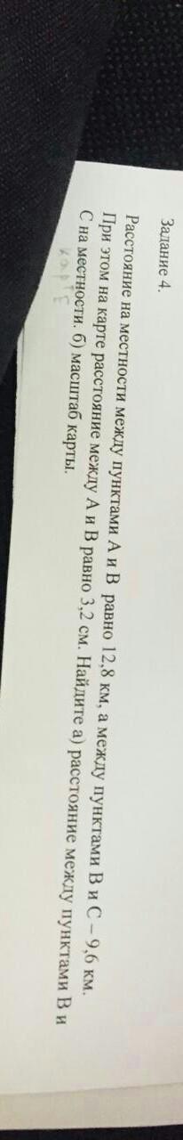 Ответ: расстояние между пунктами B и C на карте 2,4 см, масштаб карты 1:400000