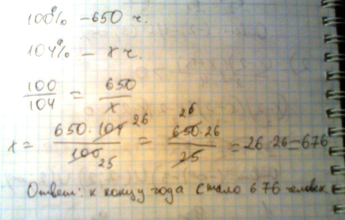 За год учеников выросло на 4%. Сколько стало учеников в школе к кончу года, если в начале года их было 650?