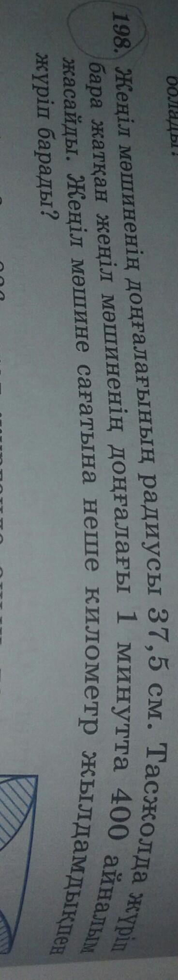 Женіл мәшиненің доңғалағының радиусы отыз жеті бүтін оннан бес см.Тасжолда жүріп бара жатқан жеңіл мәшиненің доңғалағы 1 минутта 400 айналым жасайды.Жеңіл мәшине сағатына неше километр жылдамдықпен жүріп барады.