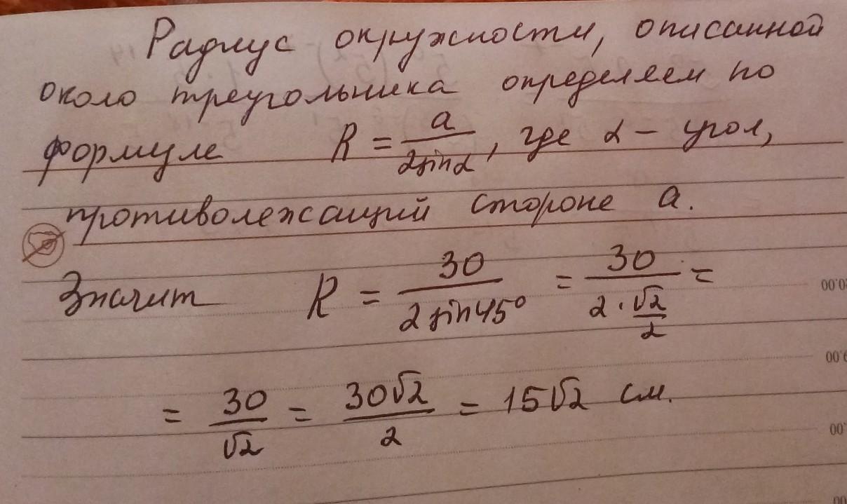 Обчисли радіус кола, описаного навколо трикутника, якщо один із його кутів дорівнює 45 ° , а протилежна йому сторона — 30 см.