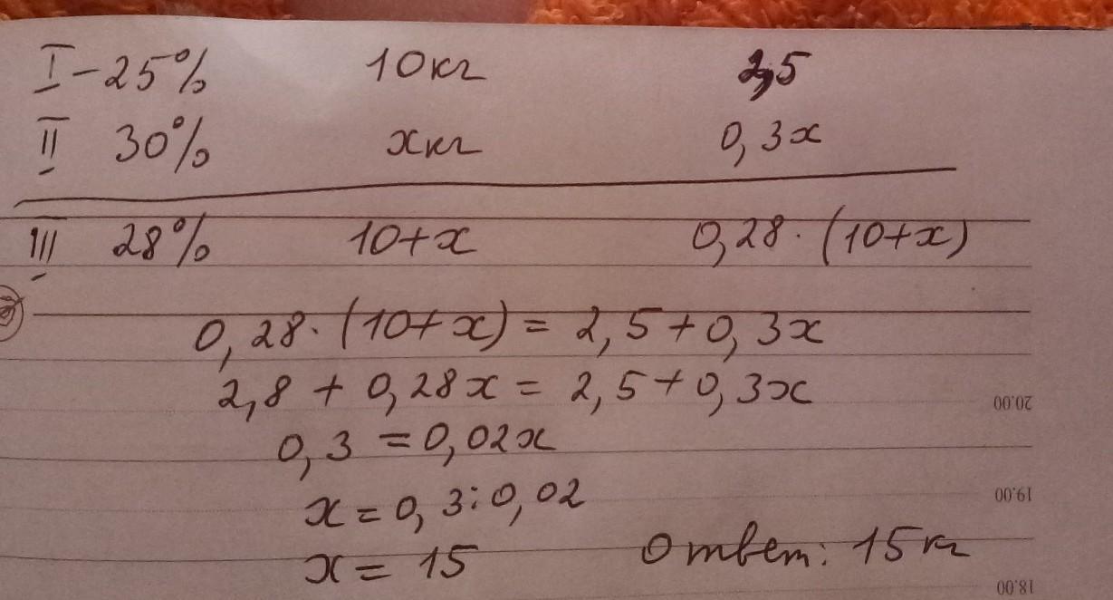 Есть два водно-солевых раствора.Первый раствор содержит 25%,а второй-30%соли. Сколько килограммов второго раствора надо добавить к 10кг первого, чтобы получить раствор, содержащий28%соли?