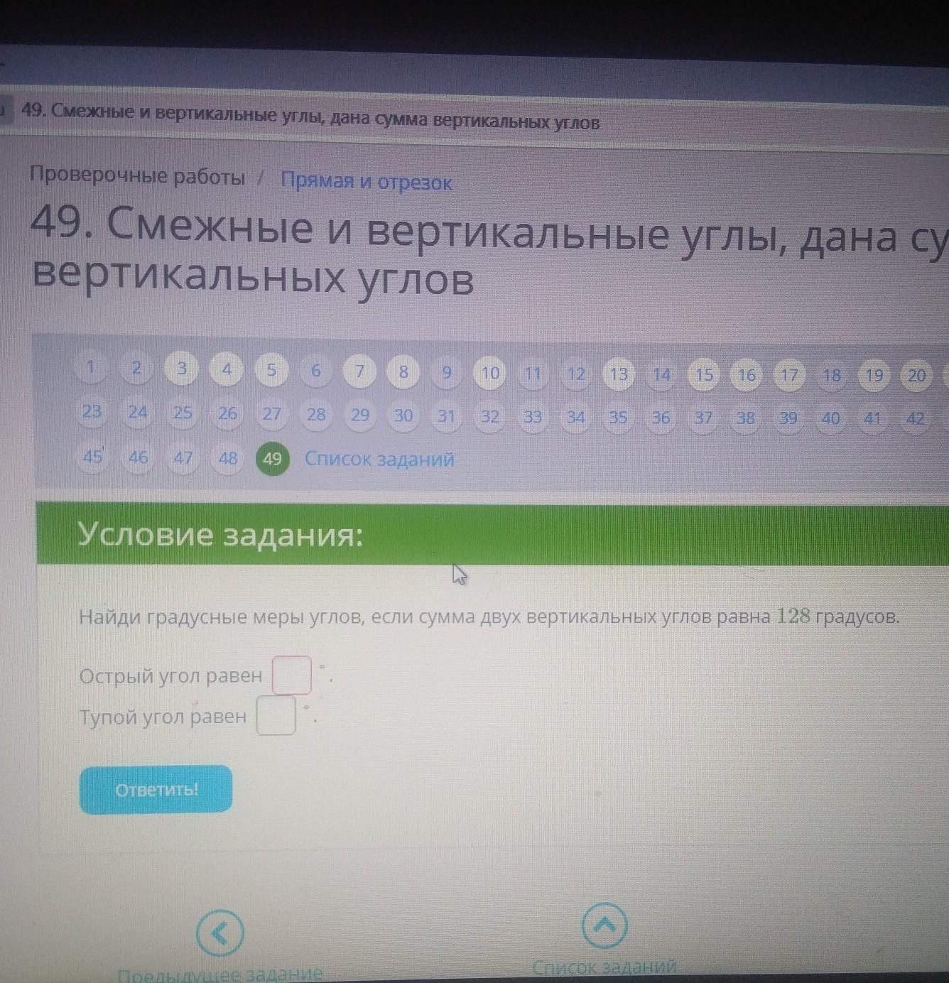 Вертикальные углы равны: 128/2=64 - острый угол