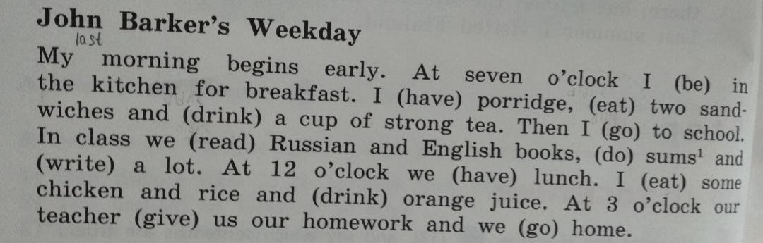 My last morning began early. At seven o'clock I (was) in the kitchen for breakfast. I (had) porridge, (ate) two sandwiches and (drank) a cup of strong tea. Then I (went) to school. In class we (read) Russian and English books, (did) sums' and (wrote) a lot. At 12 o'clock we (had) lunch. I (ate) some chicken and rice and (drank) orange juice. At 3 o'clock our teacher (gave) us our homework and we (went) home.