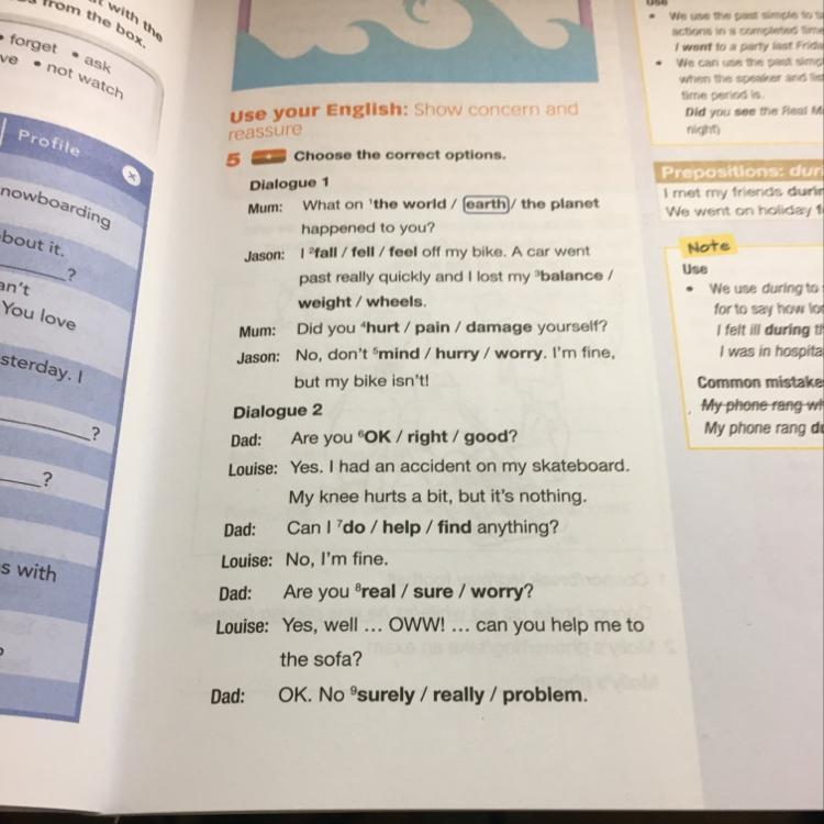 Ответ: I fell off my bike and I lost my balance. 2)hurt yourself 3) don't worry. 4) are you ok 5) can I help anything 6) are you sure 7) no problem