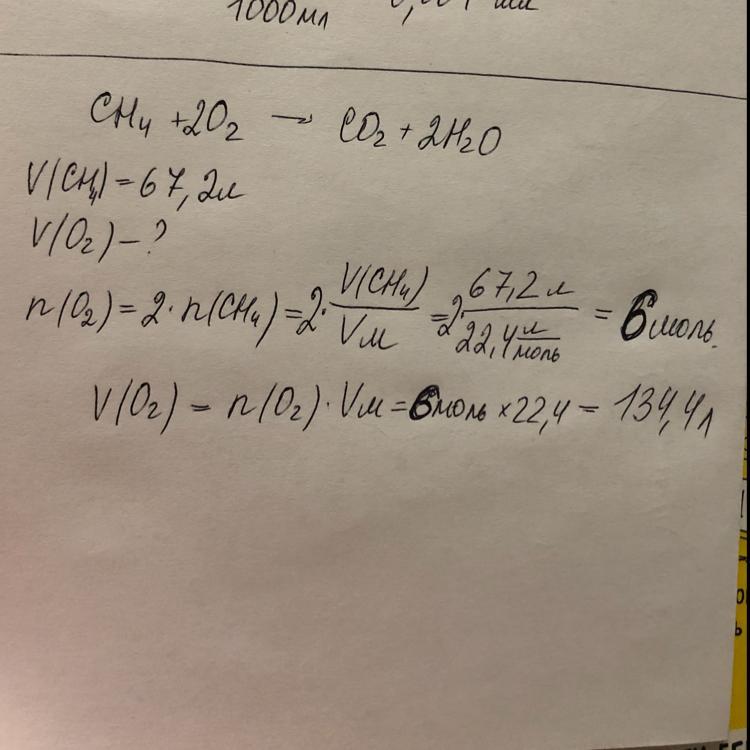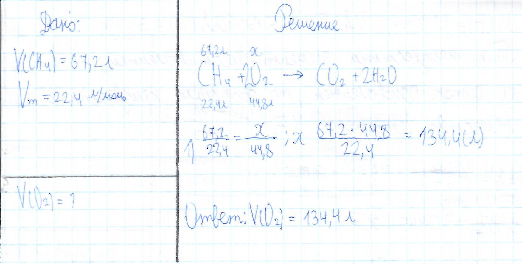 вычислить объем кислорода который потратится на сгорания 67.2 метана. Объем газов измеренное при одинаковых условиях