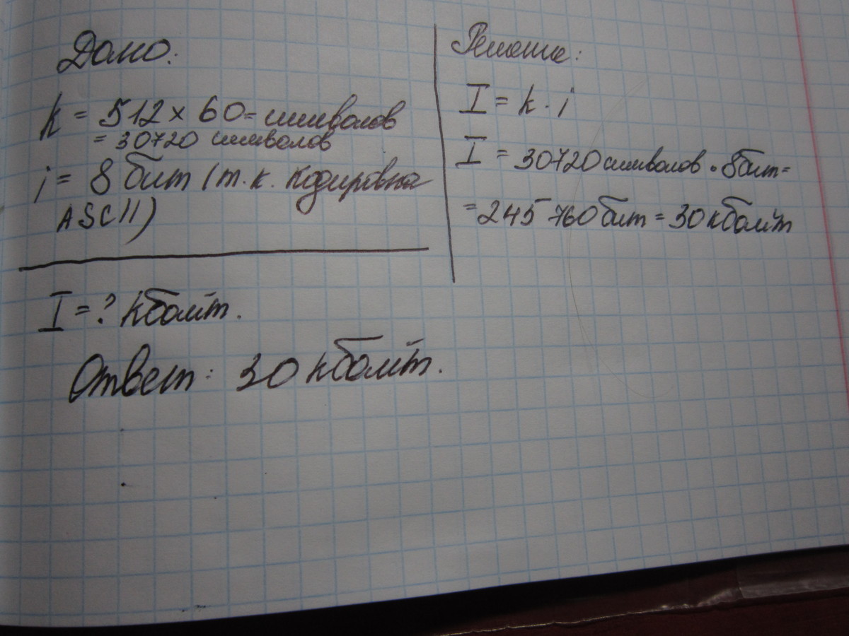 определите объём памяти в Кбайтах, занимаемый текстом из 60 страниц по 512 символов на каждой странице. (кодировка ASCII)
