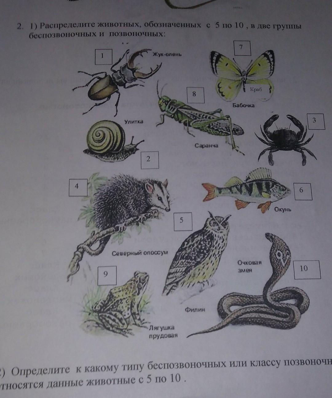 Позвоночные: 5. филин (класс Птицы), 6. окунь (класс Рыбы), 9. лягушка прудовая (класс Земноводные или Амфибии), 10. очковая змея (класс Пресмыкающиеся или Рептилии)