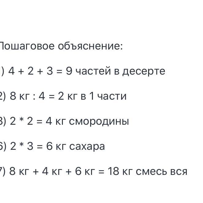 Для приготовления ягодного десерта для внуков бабушке нужно взять 4части малины,2части смородины ,3 части сахара.Сколько надо взять отдельно сахара и смородины,если имеем 8кг малины?Какова будет общая масса смеси?