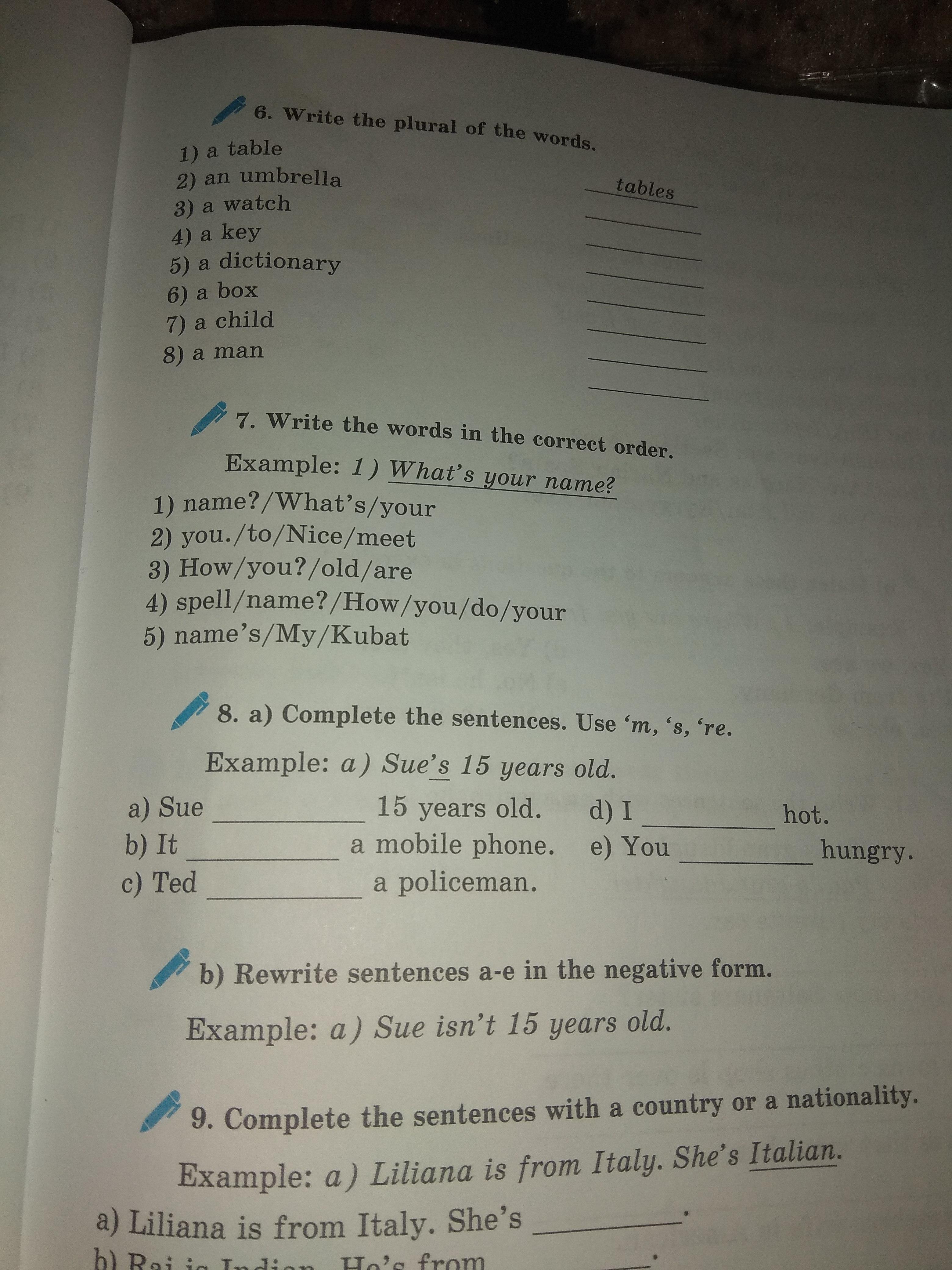 ex7 1) уже есть, 2) nice to meet you, 3) how old are you, 4) how do you spell your name, 5) my name's Kubat