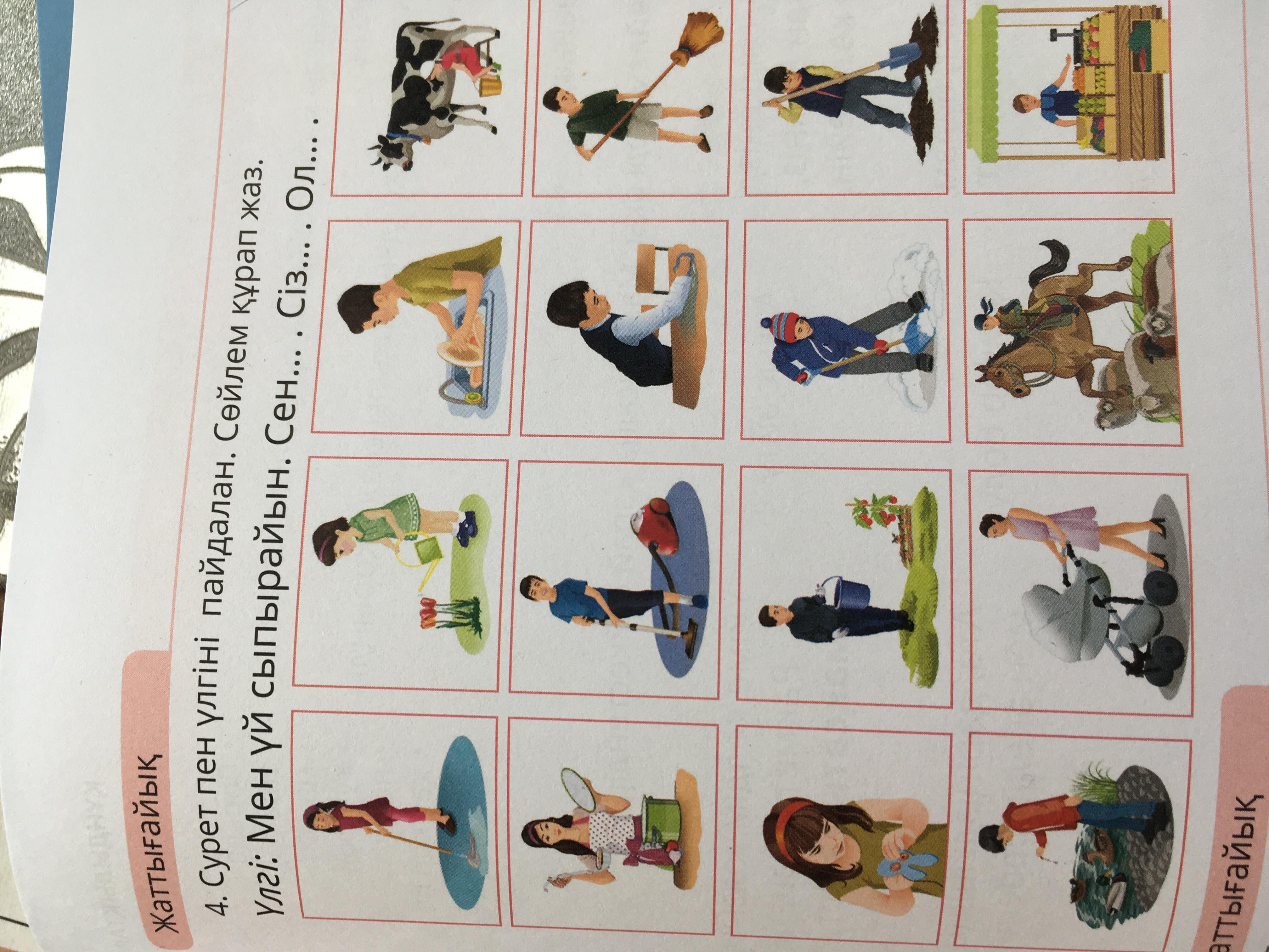 сен гүл суғарасын .Сіз тамак жасайсыз .Ол кар күрейді