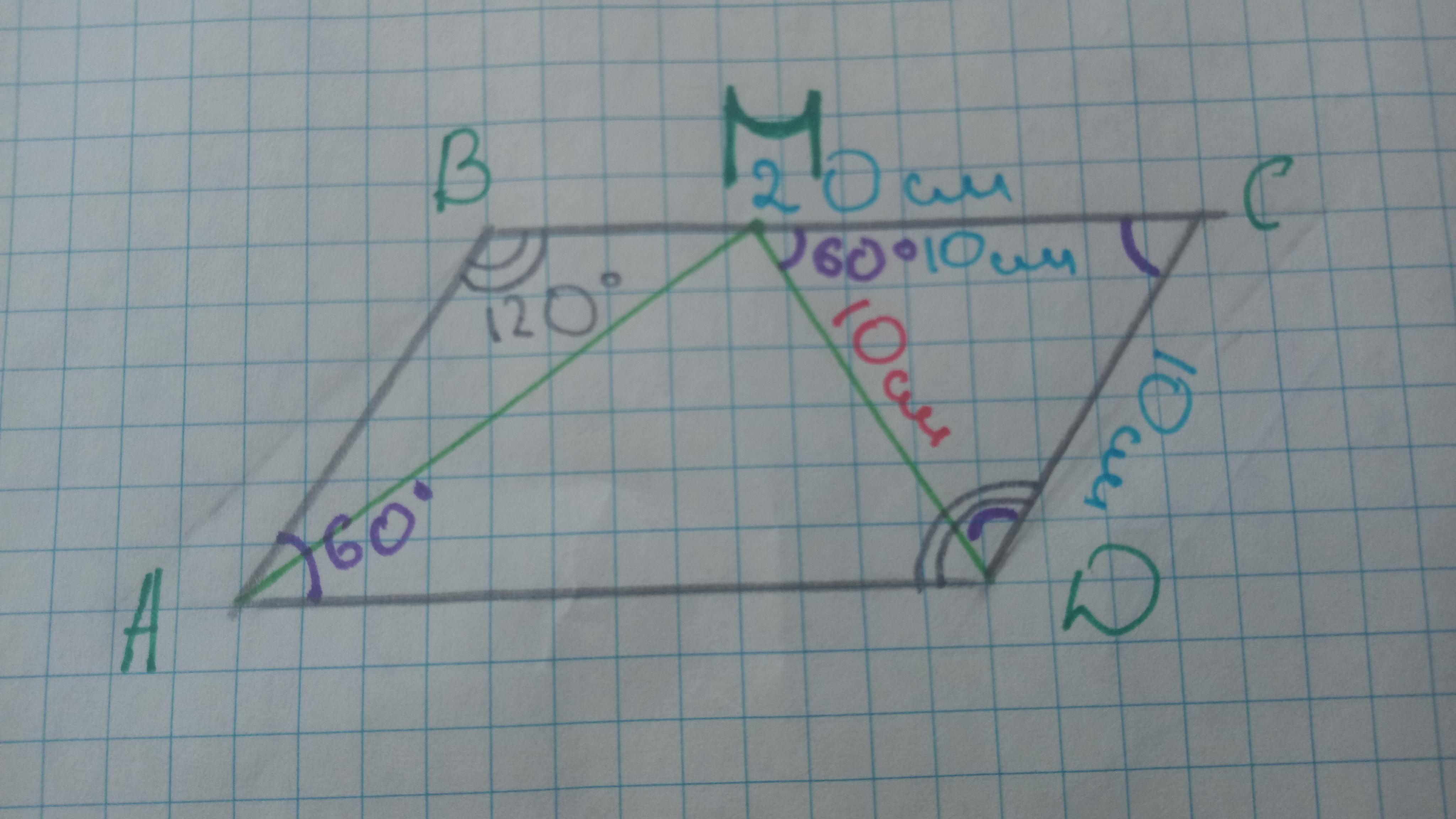 когда мы провели биссектрису MD у нас получился равносторонний треугольник у которого все стороны одинаковые: CD=DM=MC=10см и углы равняются 60 градусам: DMC=MCD=CDM=60 градусам. теперь нам известно, что стороны CD=BA=10см по скольку эти стороны параллельные. в суме эти два угла дают 20 см. чтобы найт другую сторону параллелограмма нам надо от периметра отнять 20 см и поделить на 2: (60-20):2=20 - сторона BC (AD) .углы MCD=BAD=60 градусам. чтобы найти углы ABC и BCD мы от 180 градусов отнимаем угол ABC (BCD) (потому что углы на одной стороне параллелограмма равны 180 градусам): ABC (BCD)= 180-60=120 градусов