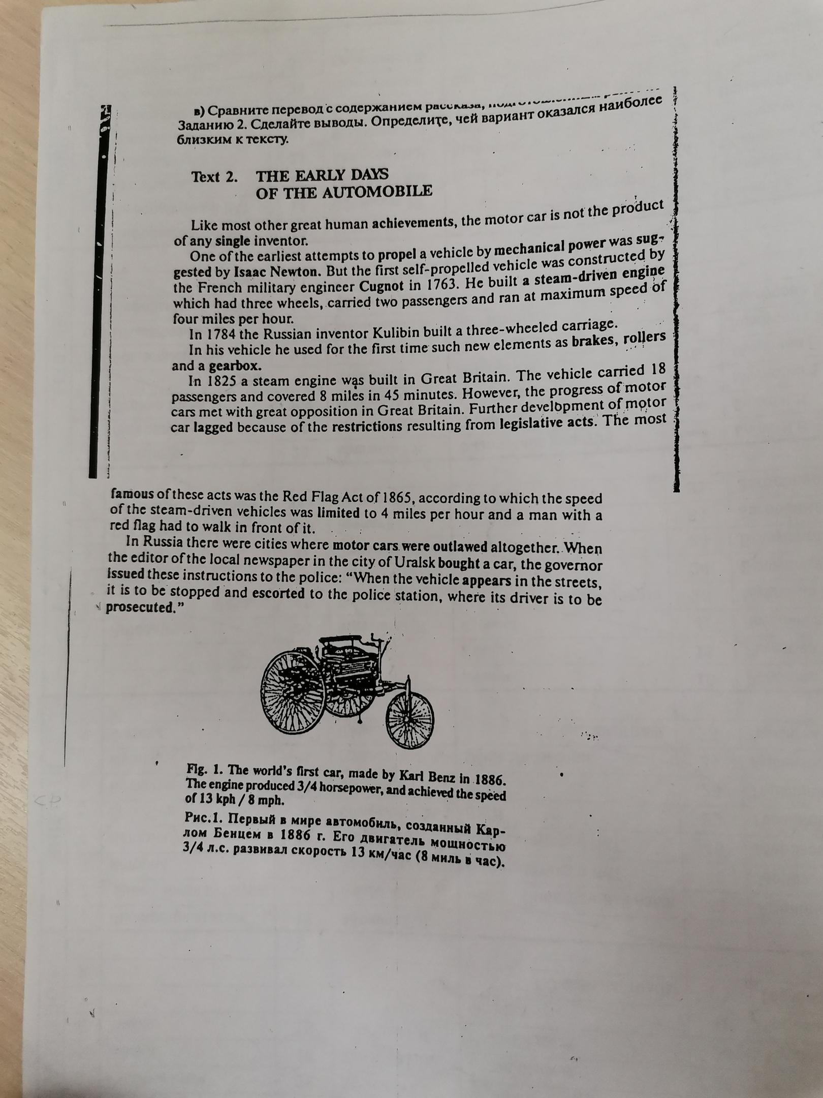 Текст 2. РАННИЕ ДНИ АВТОМОБИЛЯ И, прежде всего, великие человеческие достижения, автомобиль не является продуктом какого-либо изобретателя. Одна из самых ранних попыток привести в движение автомобиль с помощью механической энергии была предложена Исааком Ньютоном. Но первое самоходное транспортное средство было построено французским военным инженером Кугно в 1763 году. Он построил паровой двигатель, который имел три колеса, перевозил двух пассажиров и работал на максимальной скорости 4 мили в час. В 1784 году русский изобретатель Кулибин построил трехколесная коляска. В своем автомобиле он впервые использовал такие новые элементы, как тормоза, ролики и коробка передач. В 1825 году в Великобритании был построен паровой двигатель. Транспортное средство перевозило 18 пассажиров и преодолело 8 миль за 45 минут. Тем не менее, прогресс автомобилей встретил большое противодействие в Великобритании. Дальнейшее развитие автомобиля отставало из-за ограничений, вытекающих из законодательных актов. Самым известным из этих актов был Закон о красном флаге 1865 года, согласно которому скорость паровых транспортных средств была ограничена 4 милями в час, и перед ним должен был идти человек с красным флагом. В России были города, где автомобили были вообще запрещены. Когда редактор местной газеты в городе Уральске купил автомобиль, губернатор передал полиции следующие инструкции: «Когда транспортное средство появляется на улицах, его нужно остановить и отвезти в отделение милиции, где должен находиться его водитель. преследоваться по закону