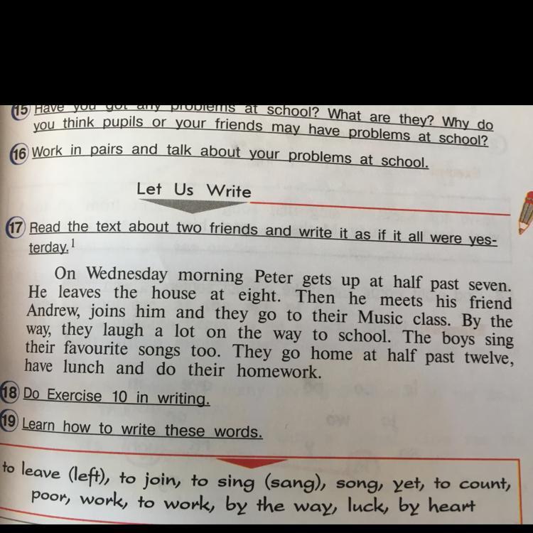 В среду утром Питер встает в половине восьмого. Он выходит из дома в восемь. Затем он встречает своего друга Андрея, присоединяется к нему, и они идут на урок музыки. Кстати, они тоже смеются над своими любимыми песнями. Они идут домой в половине двенадцатого, обедают и делают уроки.