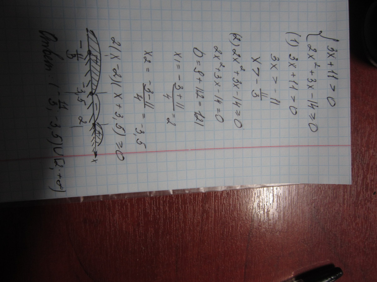 3x+11>0, x> - 2x2 + 3x -14 >=0 D = 9+4*2*14=121 X1= (-3-11)/4=-3 ½ X2 =(-3+11)/4= 2 -) ] [2;