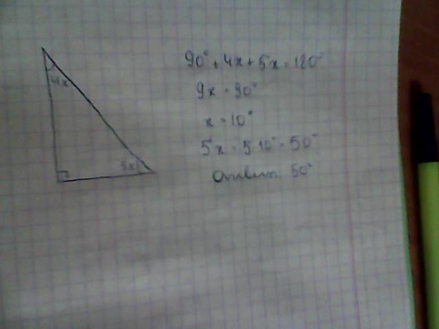 Два острых угла прямоугольного треугольника относятся как 4:5. Найдите больший острый угол. Ответ дайте в градусах.