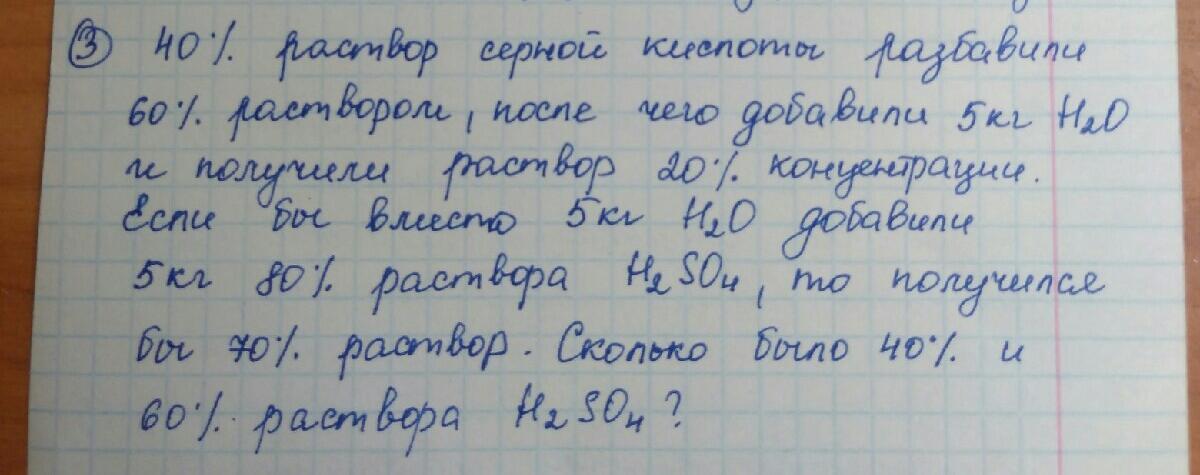 40% раствор серной кислоты разбавили 60% раствором, после чего добавили 5 кг H2O и получили раствор 20% концентрации. Если бы вместо 5 кг H2O добавили 5 кг 80% раствора H2SO4, то получили бы 70% раствор. Сколько было 40% и 60% раствора H2SO4?