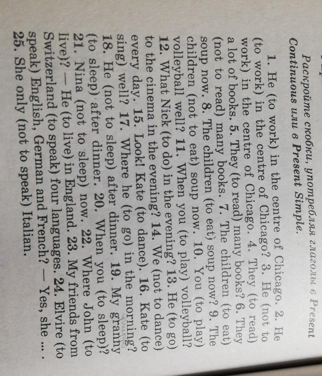 1. Не works in the centre of Chicago. 2. Does he work in the centre of Chicago? 3. He doesn't work in the centre of Chicago. 4. They read many books. 5. Do they read many books? 6. They don't read many books. 7. The children are eating soup now. 8.Are the children eating soup now? 9. The children aren't eating soup now. 10. Do you play volleyball well? 11. When do you play volleyball? 12. What does Nick do in the evening? 13. Does he go to the cinema in the evening? 14. We don't dance every day. 15. Look! Kate is dancing . 16.Does Kate sing well? 17. Where does he go in the morning? 18. He doesn't sleep after dinner. 19. My granny sleeps after dinner. 20. When do you sleep ? 21. Nina isn't sleeping now. 22. Where does John live? — He lives in England. 23. My friends from Switzerland speak four languages. 24. Does Elvire speak English, German and French? — Yes, she does. 25. She only doesn't speak Italian.