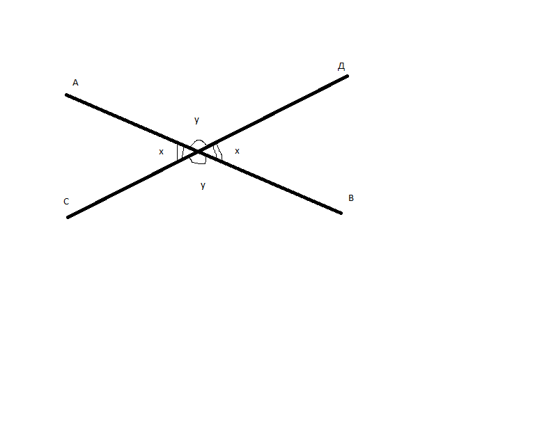 При пересечении АВ и СД образовались два вертикальных угла х и два вертикальных угла y. Вертикальные углы равны.