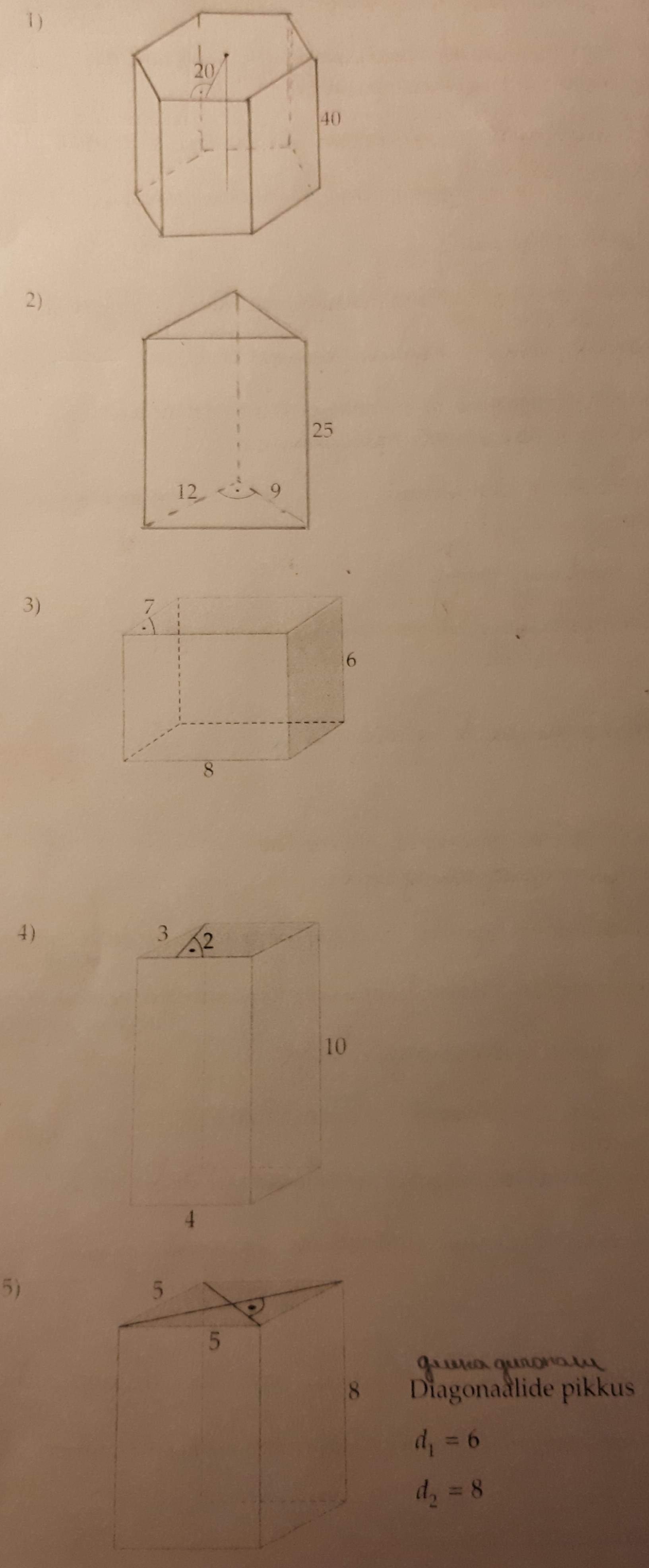 Нужно найти S основания, боковой поверхности, полной поверхности и объем каждой фигуры по каждому рисунку.